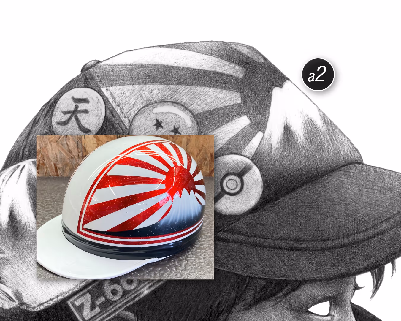 A2. Helmet - Decorated with Mount Fuji and the rising sun, a common design among Bosozoku (Japanese Biker) gangs.