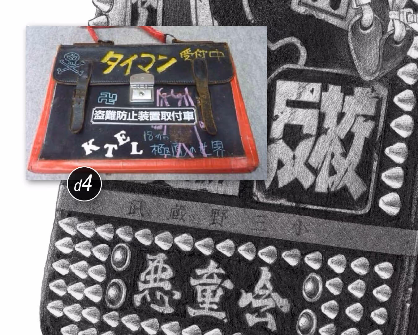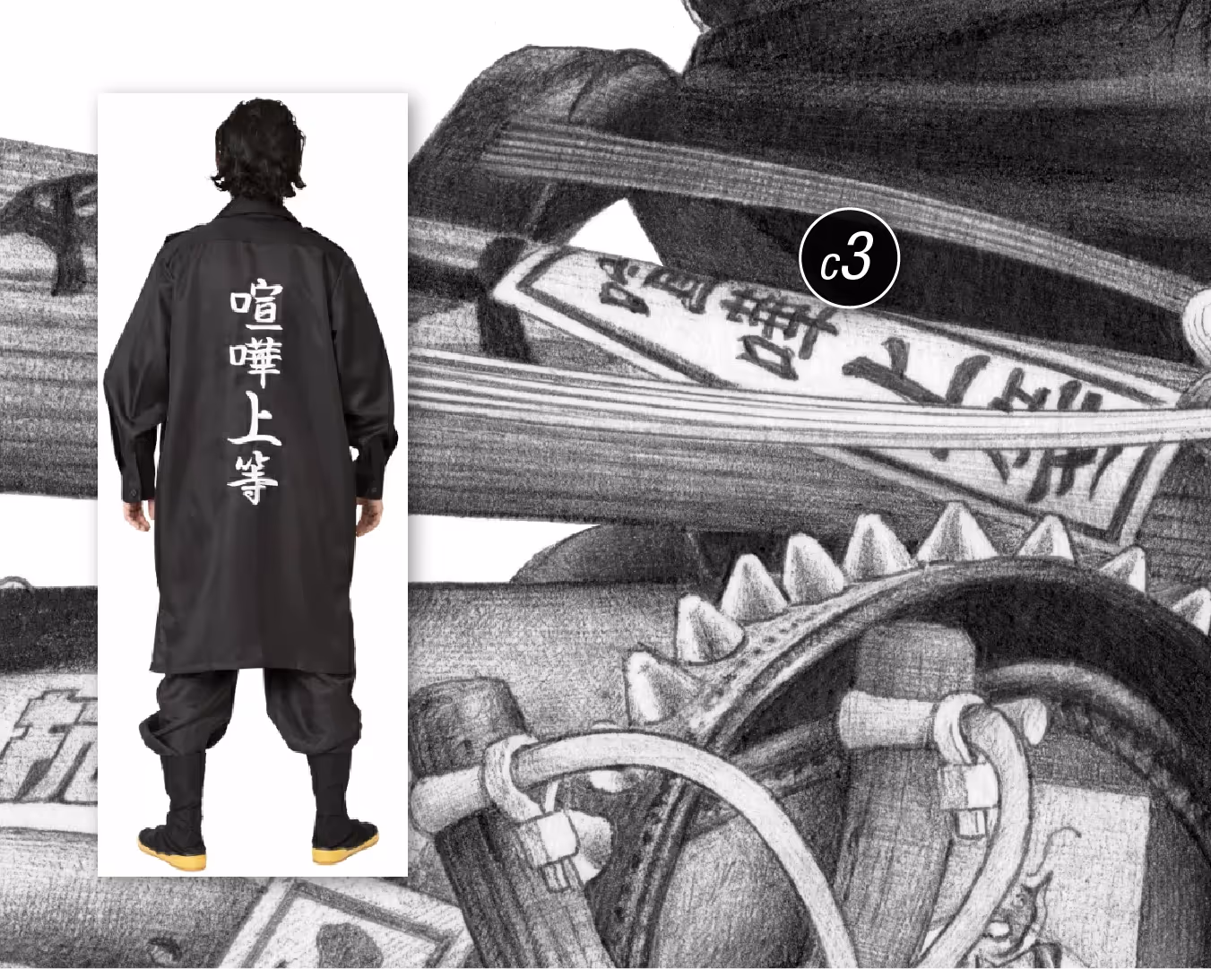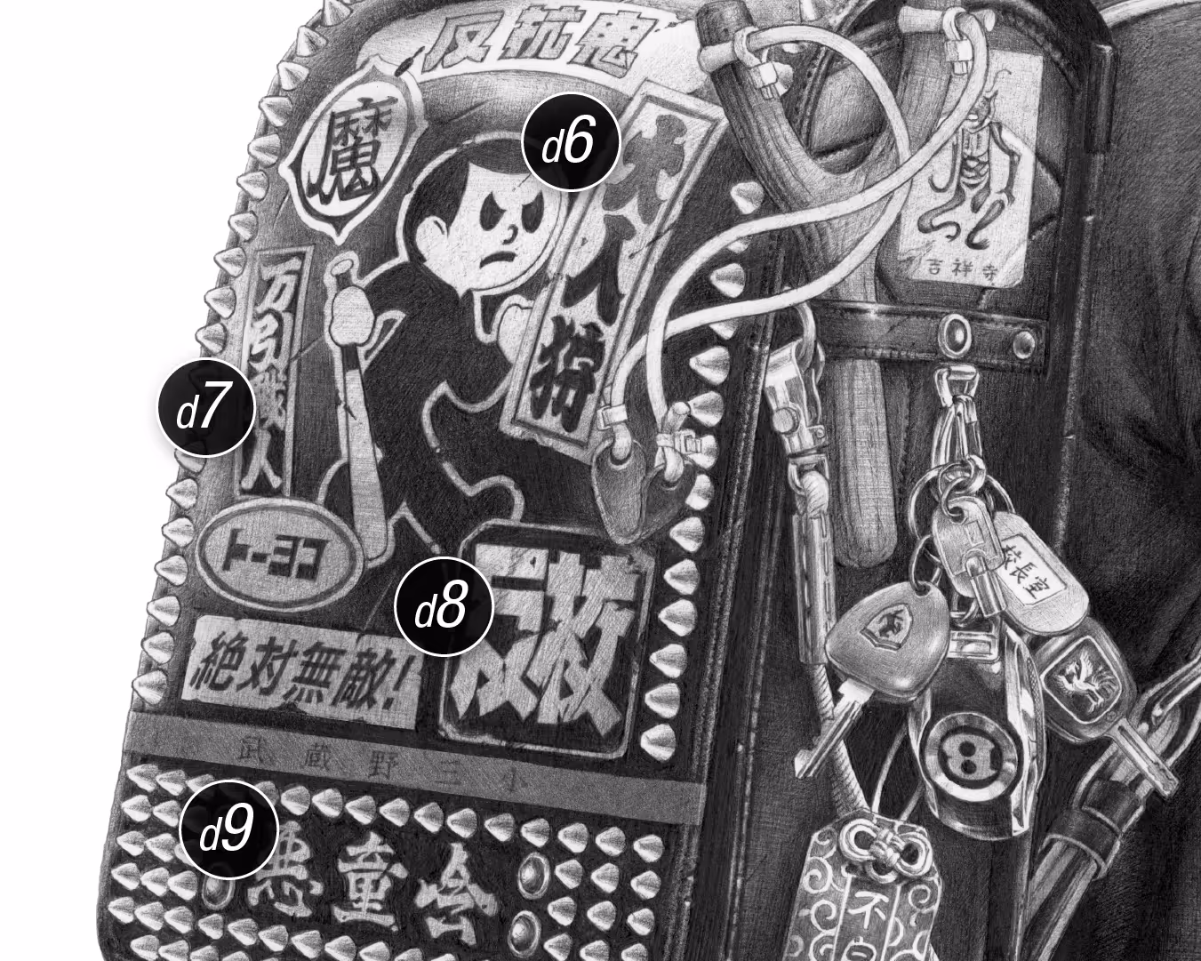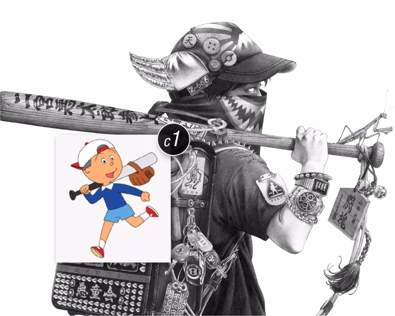 C2. 二宮悪太郎参上 (Ninomiya Akutaro Sanjou) / "Akutaro Ninomiya is here!" The name written on the bat is "Akutaro Ninomiya," a play on the historical figure Kinjiro Ninomiya, known as the god of learning. I created "Akutaro" to represent the opposite, the bad boy.