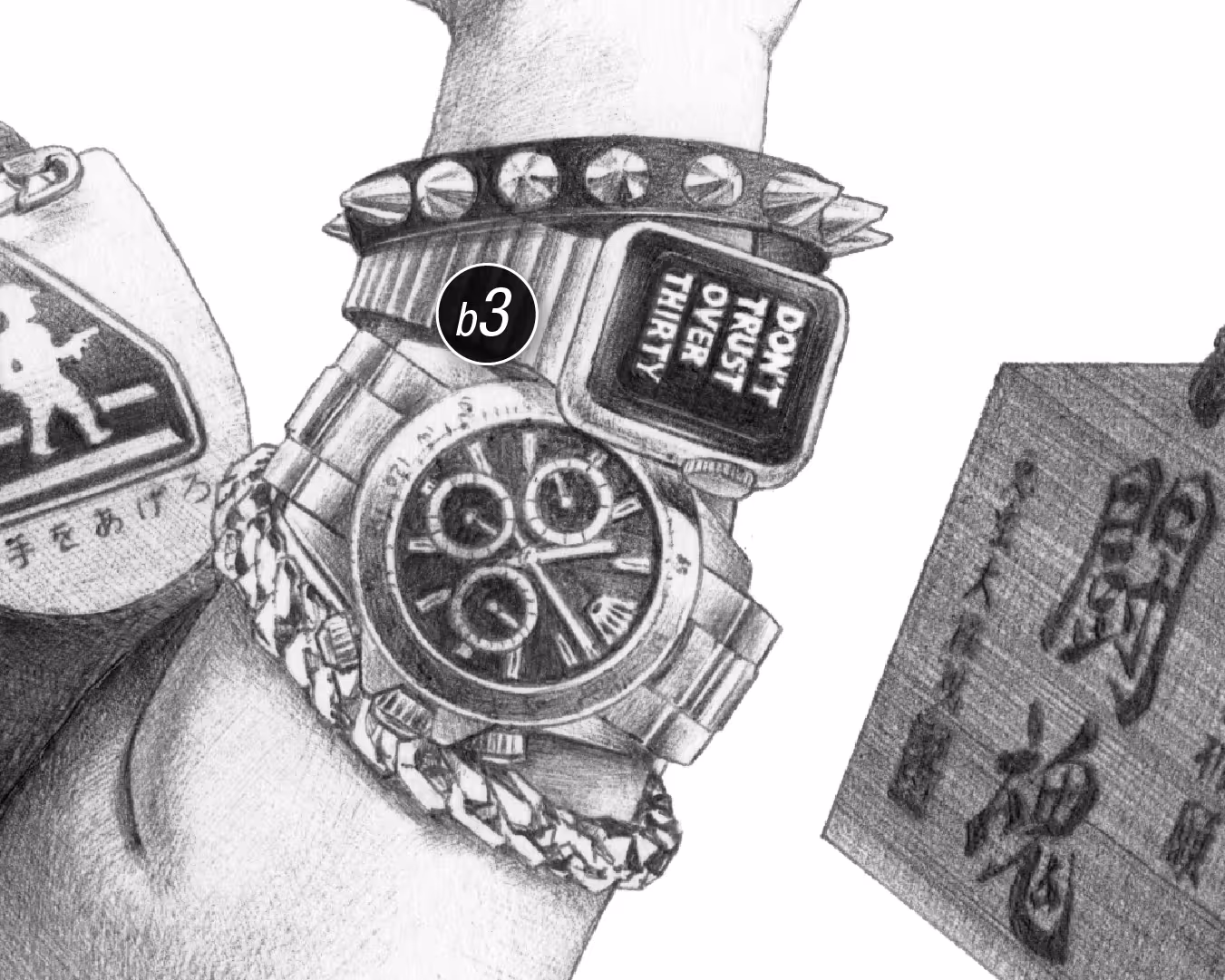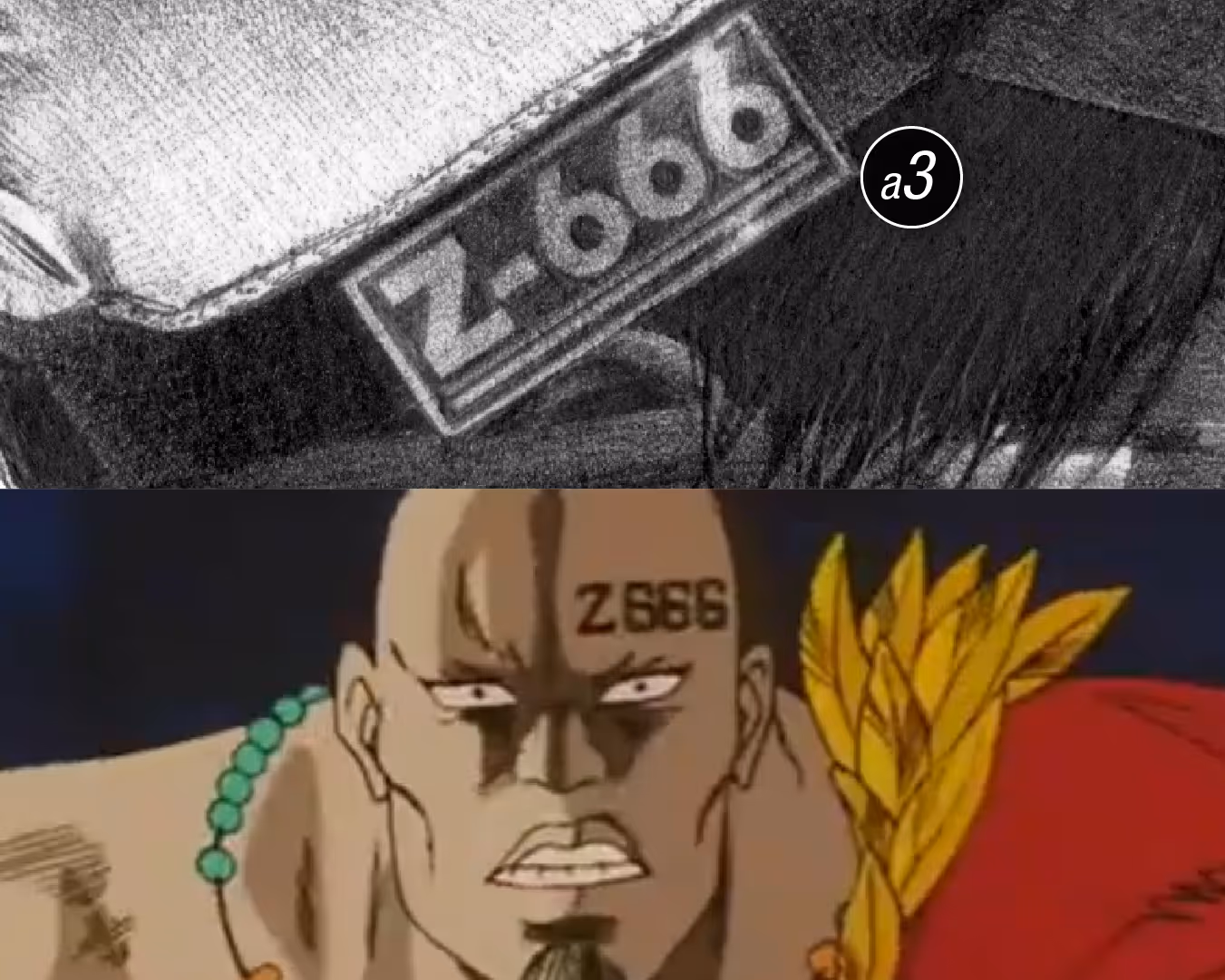 A3. Z-666 - A reference to the tattoo of gang leader Zeed in "Fist of the North Star."