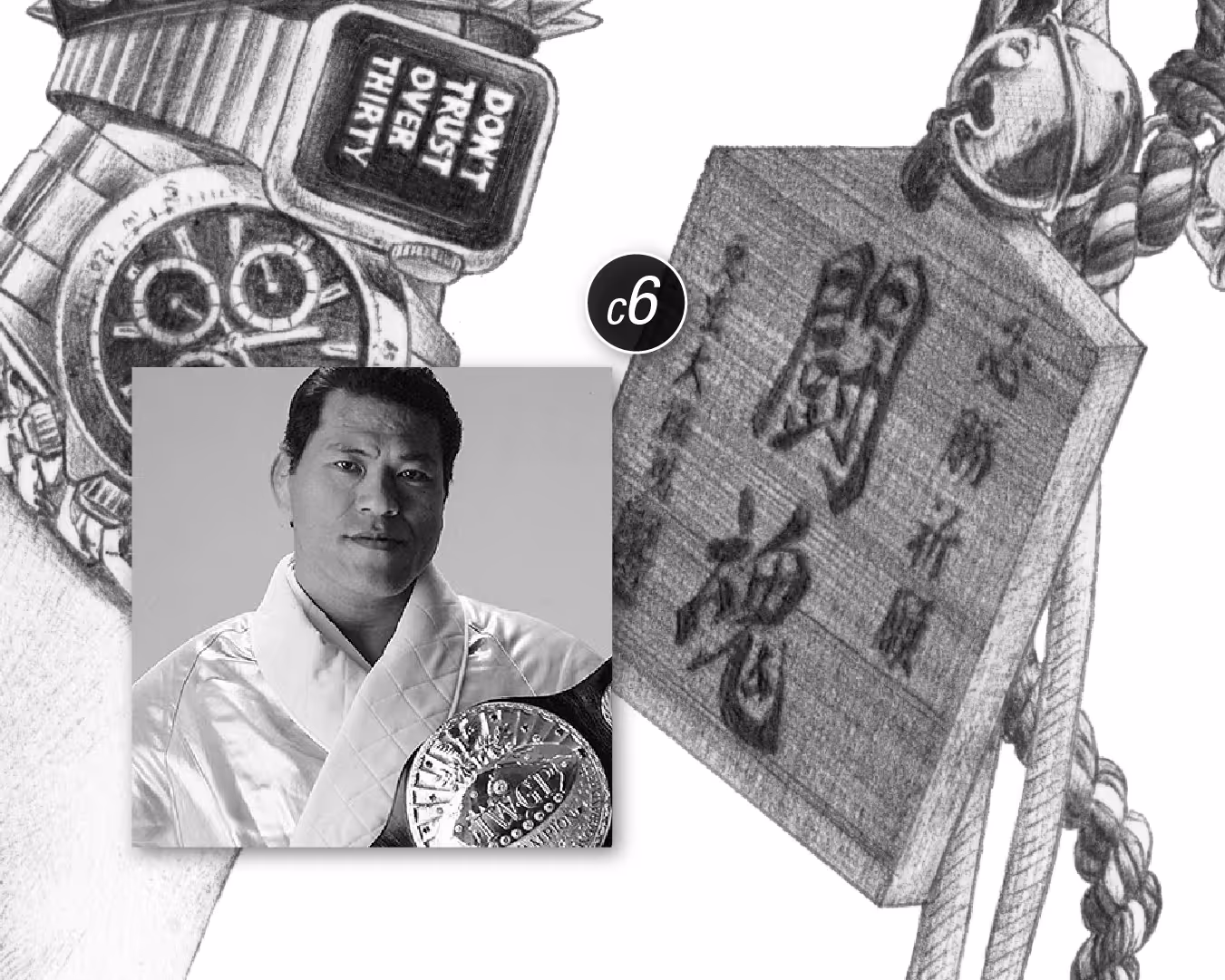 C6. 絵馬 / Ema - Ema are small wooden plaques for writing prayers or wishes in Shinto and Buddhist practices. The ema displays 闘魂 (Tōkon), or "fighting spirit," a slogan from the legendary wrestler Antonio Inoki.
